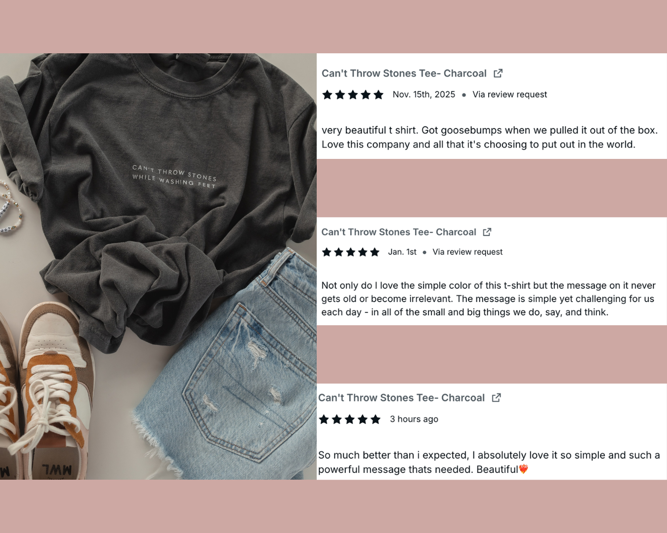 Our best seller is one of our OG designs. From the beginning our "Can't Throw Stones" tee has been one of our bestsellers. It is a design that is simple, yet holds a powerful message!